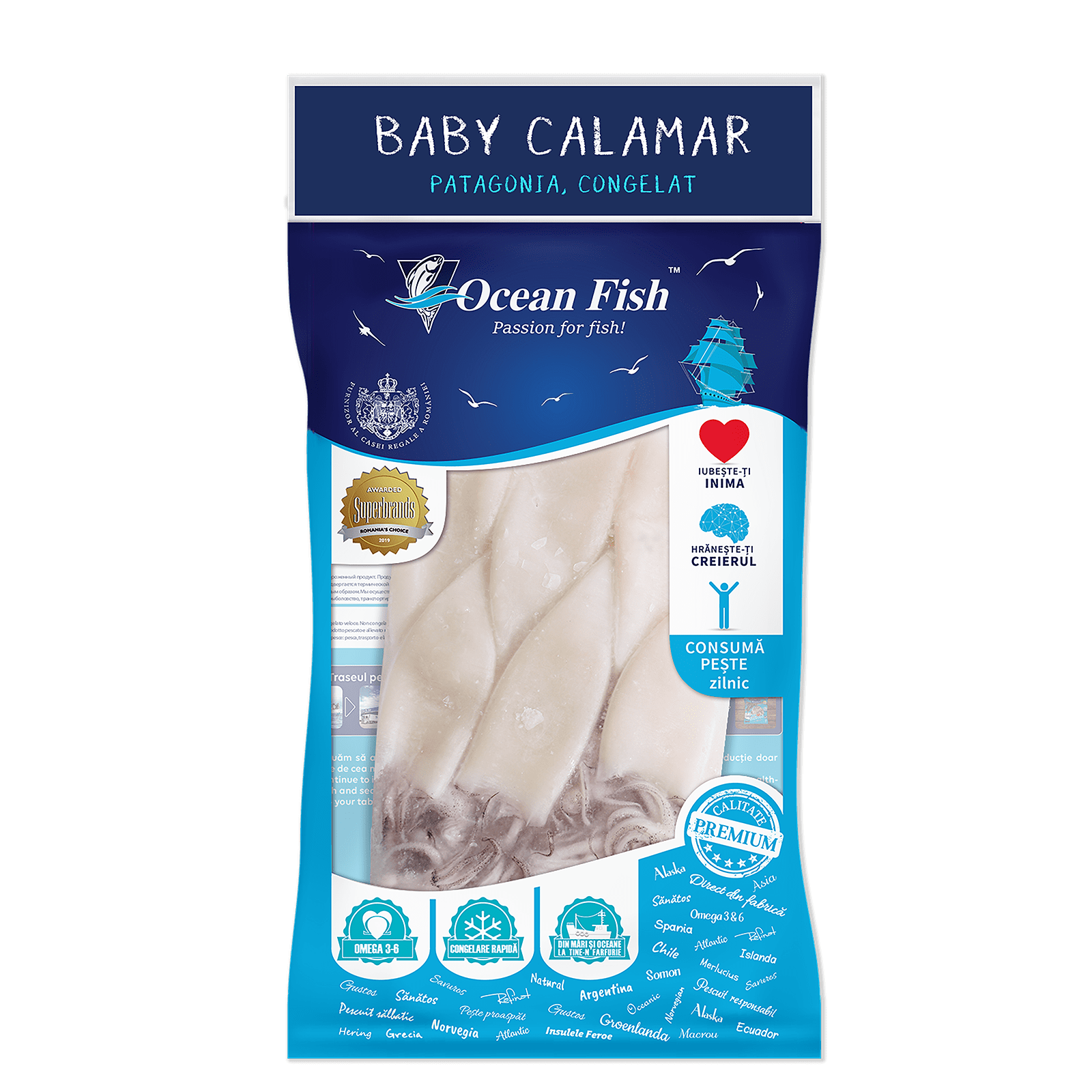 Baby calamar. Calamarul, sepia și caracatița aparțin aceleiași clase de moluște numite Cefalopode, moluște cu simetrie corporală bilaterală, cap mare și tentacule. Toate aceste fructe de mare sunt extrem de folosite atat in bucataria asiatica cat si in bucataria mediterana, intrucat sunt o sursa excelenta de proteine, acizi grasi omega-3, vitamina C, fier, calciu si foarte putine grasimi. Calamarul Baby din gama My Seafood by Ocean Fish, este curatat si rapid congelat. Mai este bogat in seleniu si in vitamina B2.